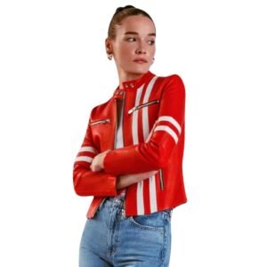 Make a statement with the Women’s Red Leather Jacket with White Stripe – a vibrant twist on a classic biker silhouette. Made from premium leather and lined with soft polyester, this jacket offers comfort without compromising style. The clean white stripe adds a sporty edge, making it the perfect go-to outerwear for transitional seasons. Whether you’re hitting the streets or heading out with friends, this piece ensures you stay confidently stylish.